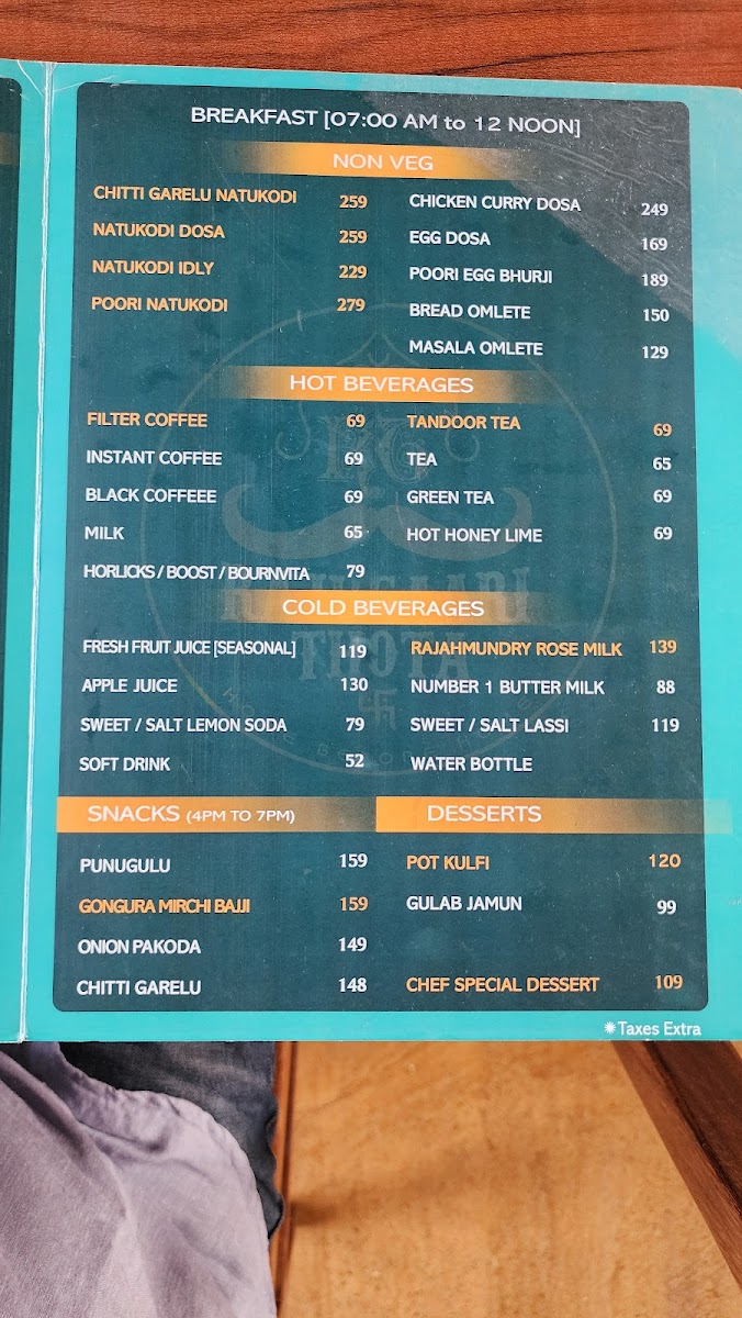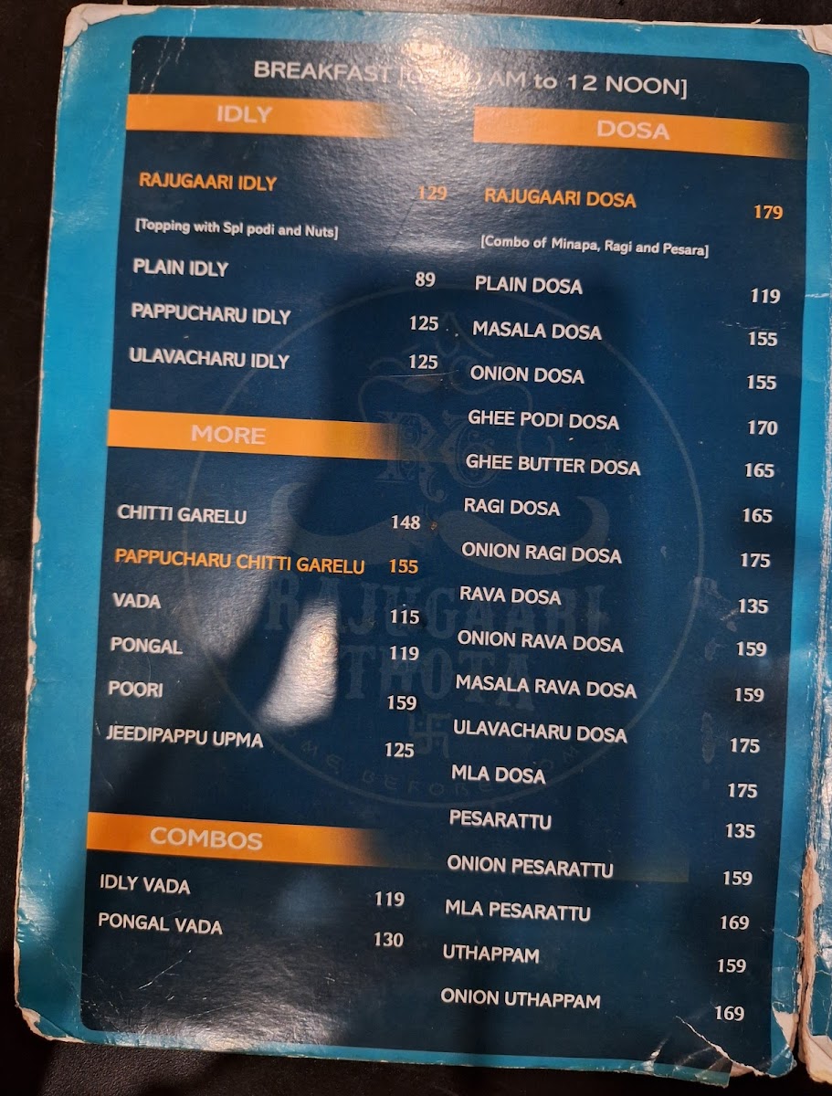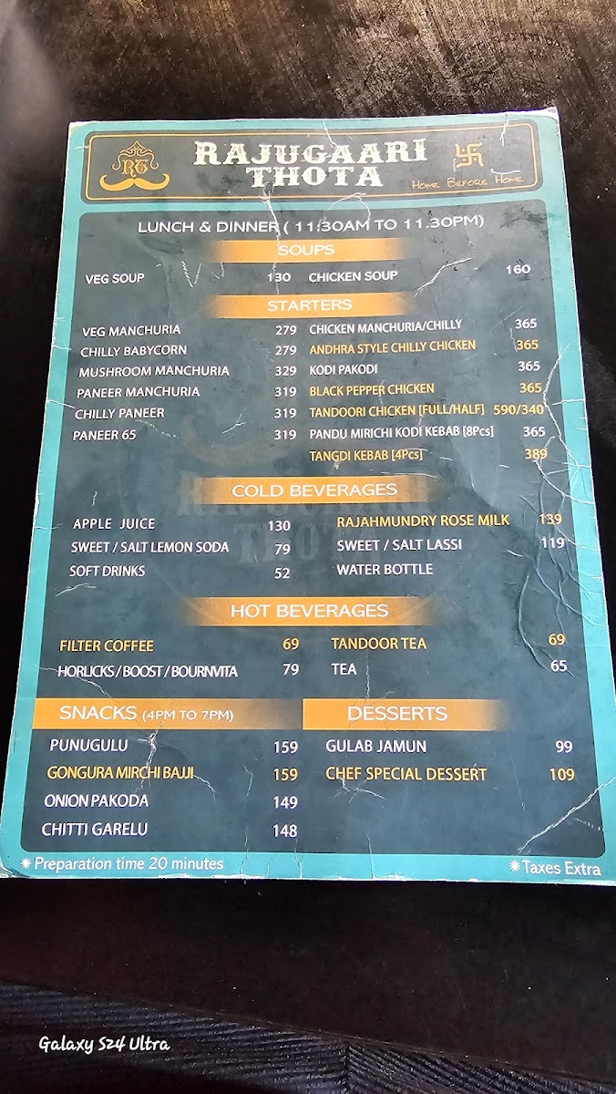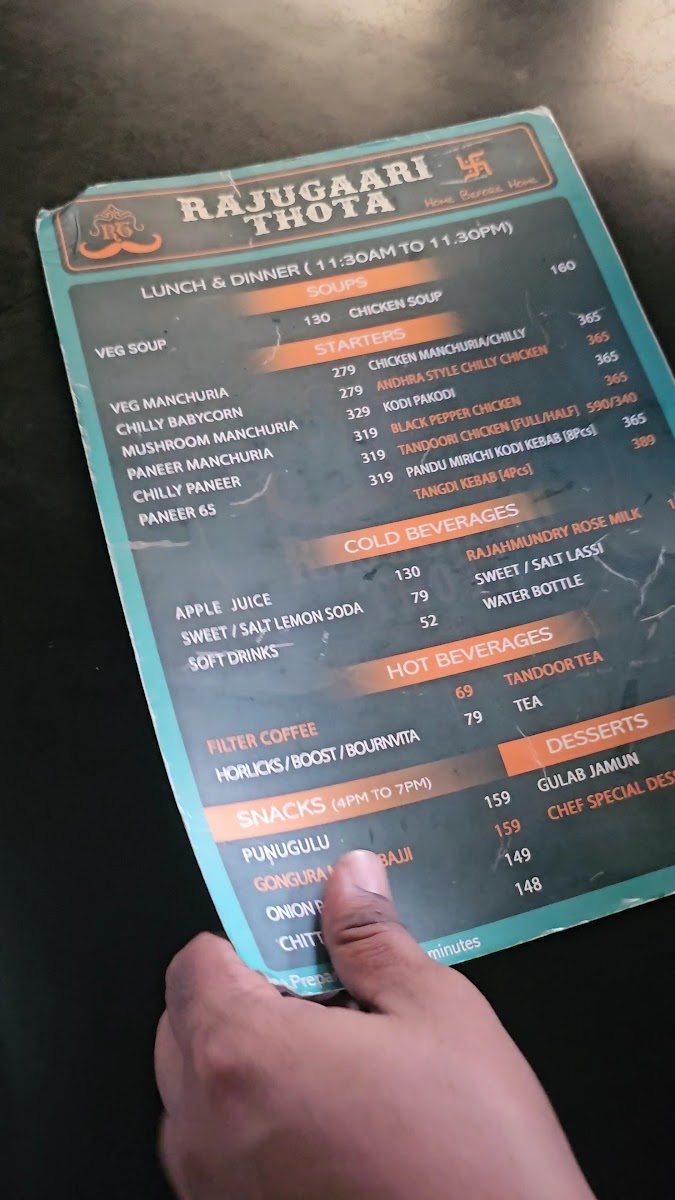 The beverage options are equally compelling, featuring everything from classic Filter Coffee to refreshing Green Tea. Save room for desserts like Gulab Jamun and the chef's special, each providing a sweet finishing touch to your meal. Rajugari Thota Hotel is not just a stopover; it’s an experience that celebrates the rich culinary heritage of the region.